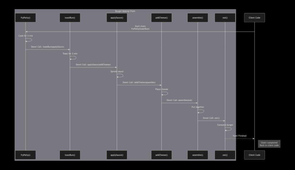 Let’s imagine the following scenario: you are making a burger. To do this, you need to fry the patties, toast the buns, spread the sauce, add the cheese, and assemble the burger. Only after all these steps are complete you can finally eat it.